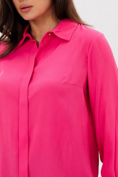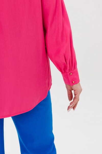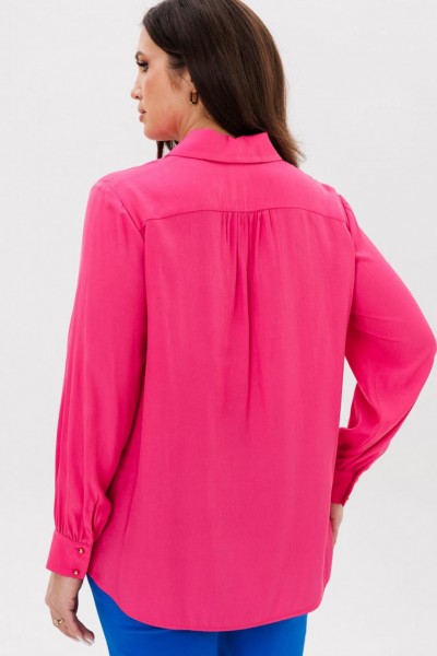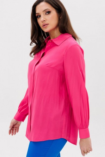 Эта стильная блуза ярко-розового цвета представляет собой идеальный выбор для современной женщины, стремящейся добавить яркость в свой гардероб. Блуза имеет свободный силуэт, что обеспечивает комфорт и удобство при носке. Спереди расположена планка с потайной застёжкой на семь пуговиц, что придает изделию аккуратный и элегантный вид. На спинке добавлена кокетка со сборкой, создающая изящный объем и добавляющая блузе женственности. Рукава длинные, одношовные втачные, завершаются широкой манжетой с двумя складками, что добавляет рукавам обьём и стилевую изюминку. Отложной воротник на стойке подчеркивает шею и обрамляет лицо. Боковые швы блузы незаметно заканчиваются небольшими разрезами, облегчающими движения и придающими дополнительный стиль. Эта блуза легко сочетается как с деловыми, так и с повседневными нарядами, становясь незаменимым элементом в гардеробе.