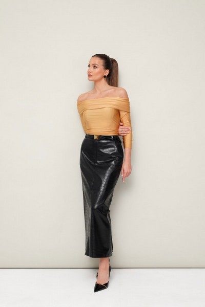 Блуза с открытыми плечами прилегающего силуэта, выполнен из эластичного полотна - бифлекс. По верхнему срезу обработан широкий отворот.
