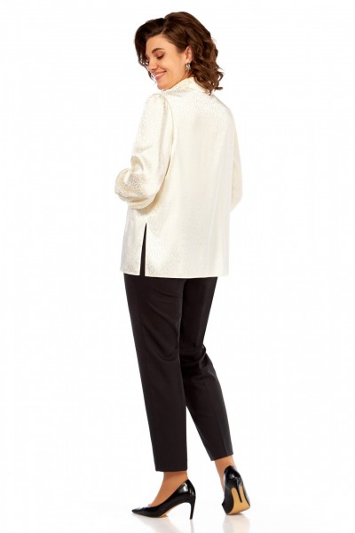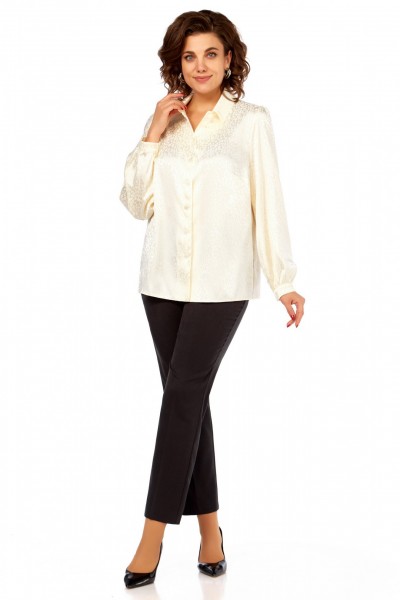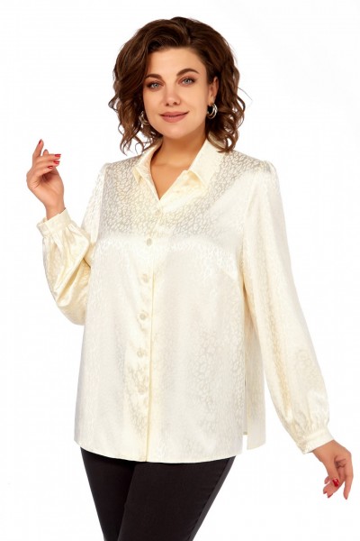 Блузка прямого силуэта, выполнена из ткани типа тонкого атласа с жаккардовым рисунком. Воротник на стойке, застежка на пуговицы, по боковым швам разрезы. Рукав длинный, расширенный, сверху небольшая сборка, внизу тоже сборка + притачная манжета с пуговицей.