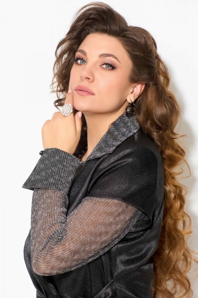 Блузка ""Аста"" нарядная, прилегающего силуэта, выполнена из жатой сетки. По горловине полочки рюша. В рюшу вставлен шнур. Застежка однобортная на навесные петли и пуговицы. Воротник отложной, на стойке, рубашечного типа. Рукав втачной, по низу рукава отложной манжет с застежкой на навесные петли и пуговицы.