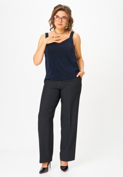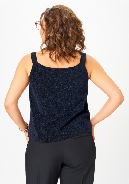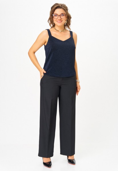 Топ прямого силуэта на широких бретелях, выполнен из трикотажного полотна с люрексом. Перед с нагрудными вытачками. Горловина переда лёгкой V-образной формы. Спинка цельнокроеная.
