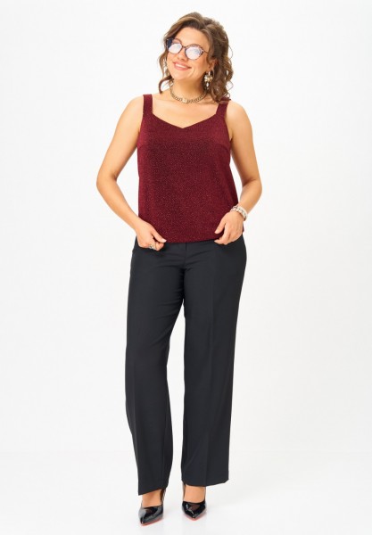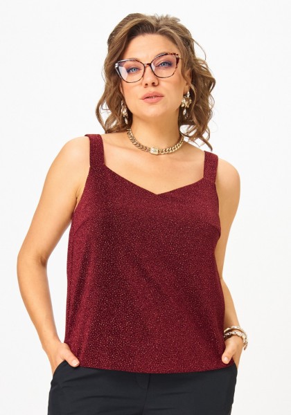 Топ прямого силуэта на широких бретелях, выполнен из трикотажного полотна с люрексом. Перед с нагрудными вытачками. Горловина переда лёгкой V-образной формы. Спинка цельнокроеная.