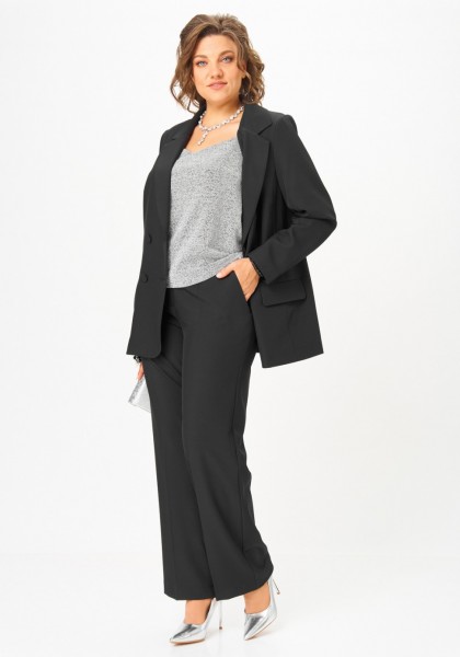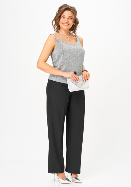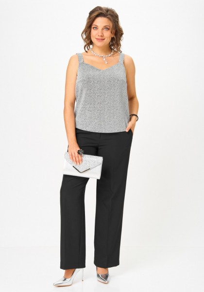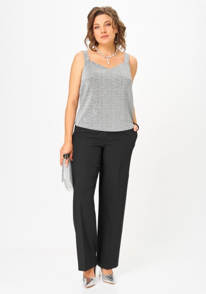Топ прямого силуэта на широких бретелях, выполнен из трикотажного полотна с люрексом. Перед с нагрудными вытачками. Горловина переда лёгкой V-образной формы. Спинка цельнокроеная.