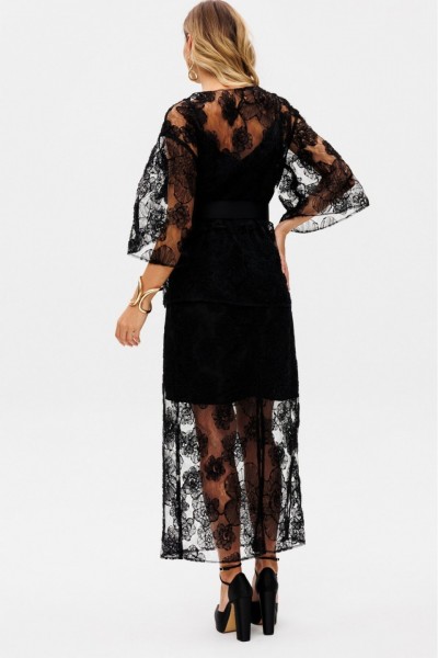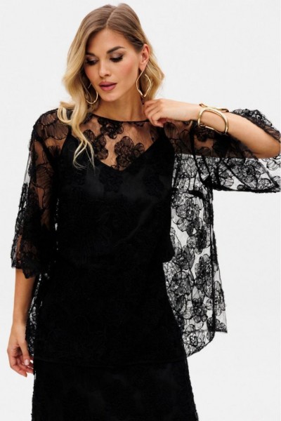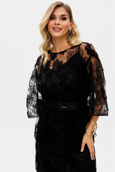 Блузка выполнена из сетки с цветочной аппликацией. Блузка прямого силуэта, длиной до линии бедер. Перед и спинка цельные. Горловина округлой формы. Плечевой шов удлинен. Рукав рубашечного покроя, одношовный, длиной ниже линии локтя. В комплект входит съемный топ на регулируемых бретелях, из атласа. Топ прямого силуэта, длиной до линии бедер.