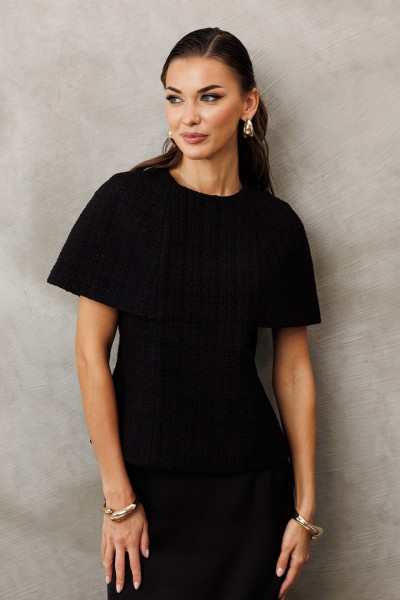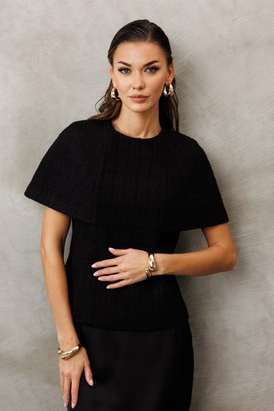 Блузка-кейп из костюмной ткани прилегающего силуэта без рукавов. Полочка и спинка с рельефами. Спинка с центральной застежкой на тесьму-молнию. Блузка на подкладке.