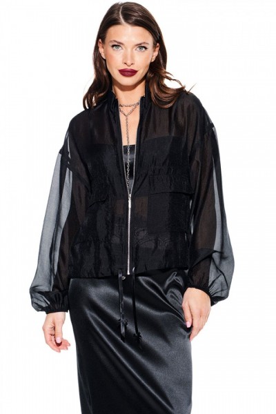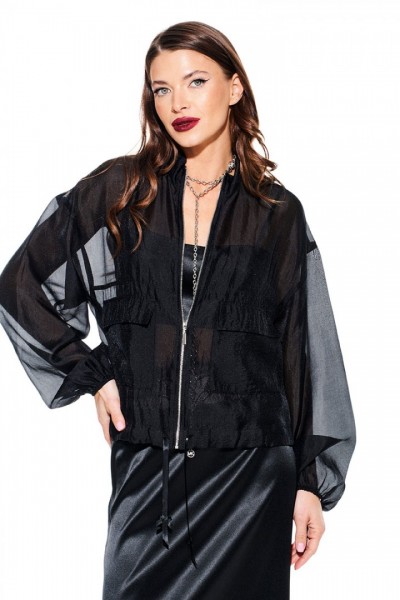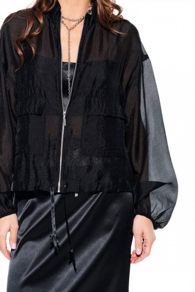 Блузон из органзы, умеренного объема, прямого силуэта, со спущенной линией плеча, с центральной застежкой на тесьму-молнию. На деталях переда горизонтальный подрез и накладные карманы с клапаном. Воротник – стойка. Спинка цельная. Нижний срез оформлен кулиской. В кулису продета декоративная тесьма для регулировки объема и формирования сборки. Рукав втачной, длинный, со сборкой на резинку по нижнему срезу.
