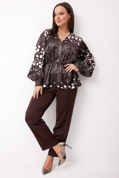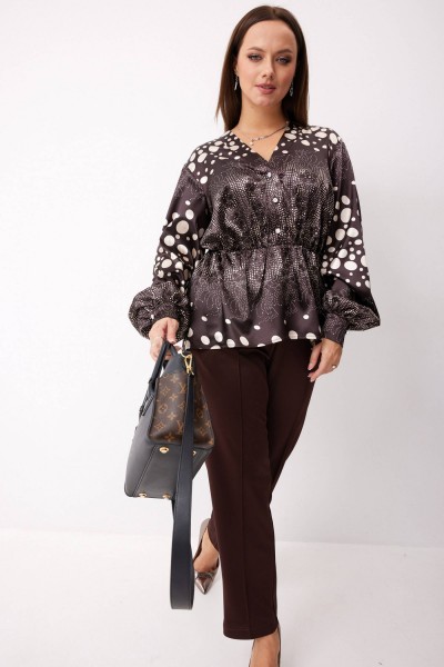 Блуза свободного кроя. Передняя часть на притачной планке, имеющей застёжку на петли-пуговицы. V-образный вырез формирует красивое декольте.