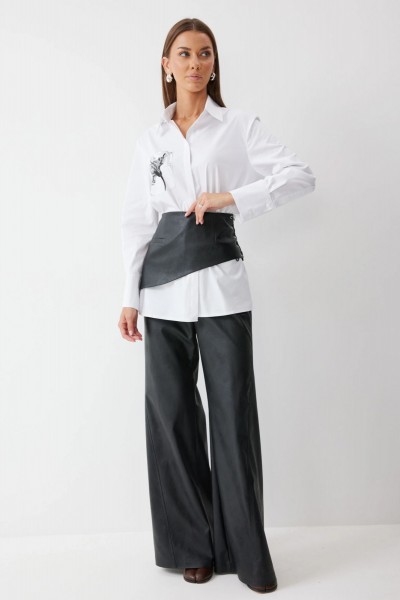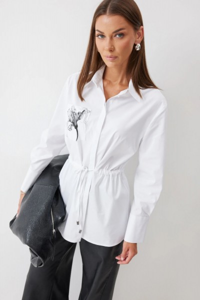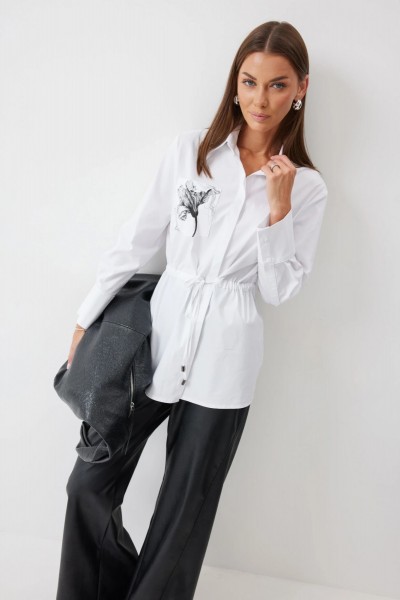 Блузка полуприлегающего силуэта. На уровне талии расположена кулиска с и завязками для регулирования степени прилегания. По центру супатная застежка, воротник рубашечный стояче-отложной. Рукав втачной. В верхней части полочки расположен накладной карман с дизайнерской печатью.