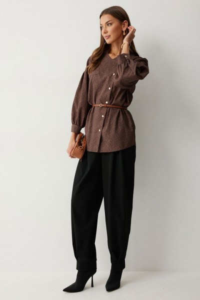Ассиметричная блузка прямого силуэта. Низ фигурный. Рукав, спущенный с встречной складкой по центру. По низу манжета с застежкой на кнопку. По переду декоративная настрочная листочка. Ассиметричная двубортная застежка на кнопки. Воротник-стойка. Обращаем ваше внимание, что фурнитура может незначительно отличаться от фото.