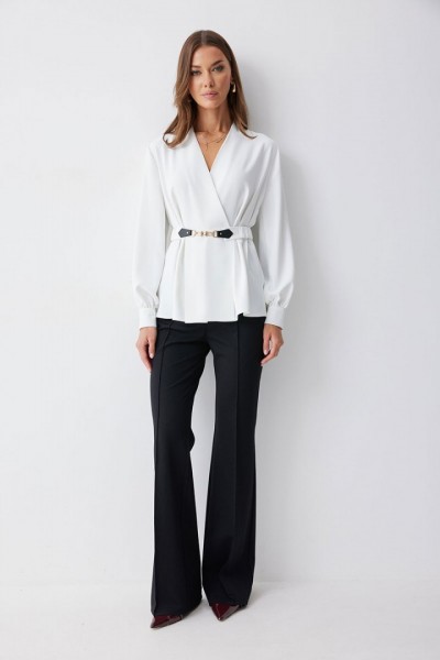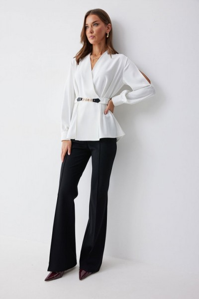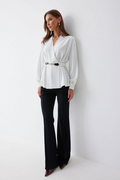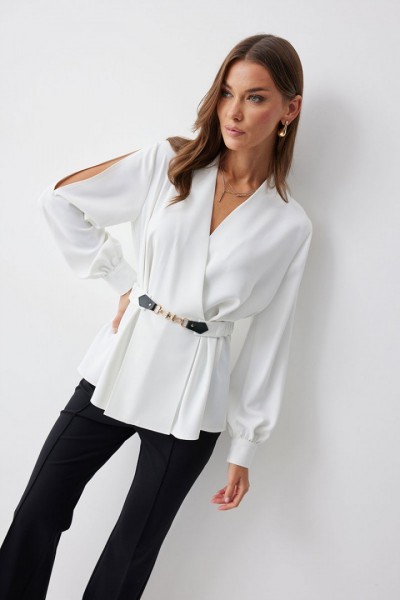 Блузка полуприлегающего силуэта расширенная книзу из струящейся ткани. Рукав втачной, с разрезом в области плеча, по низу манжета с застежкой на петли и пуговицы. Блузка отрезная по линии талии. По переду от подреза вверх и вниз декоративные складки. На спинке в подрез вставлена резинка. В комплект входит съемный ремень. Обращаем ваше внимание, что фурнитура может отличаться от фото.