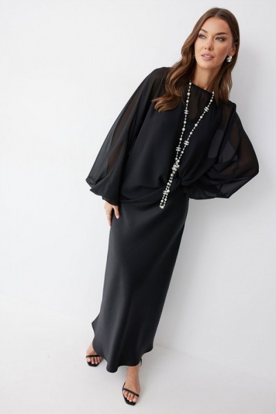Блуза из шифона. Свободного, расширенного силуэта, с широким цельнокроеным рукавом со сборкой по нижнему срезу. Рукав с манжетой, манжета с застежкой на петлю с пуговицей. Горловина овальной формы. Застежка по среднему шву спинки на петлю с пуговицей. Нижняя блуза из струящейся ткани. Силуэт прямой, свободный. С глубоким V- образным вырезом горловины по переду. С нагрудными вытачками.