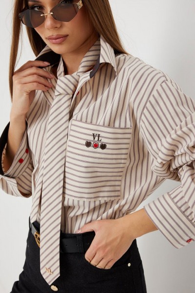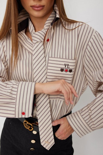 Блузка женская «oversize» силуэта, из рубашечной ткани в полоску. На спинке кокетка с оригинальной вышивкой. Застежка на петли и пуговицы, по переду карман с вышивкой, рукав свободный, по низу манжета, состоящая из двух частей, с помощью данного элемента возможно сделать рукав более или менее объёмным внизу. В комплекте с блузкой декоративная деталь, завязывающаяся в виде галстука. Воротник рубашечный со стойкой.