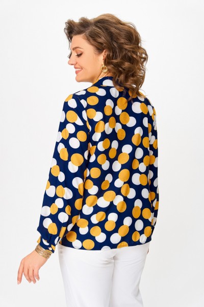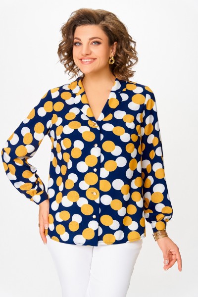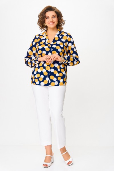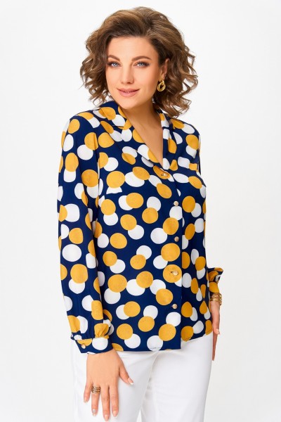Блузка женская прямого силуэта из вискозной ткани с центральной застёжкой на петли и декоративные пуговицы. Полочки с нагрудными вытачками, спинка цельная. Воротник отложной с лацканами пиджачного типа. Рукав втачной одношовный, внизу со сборкой и притачной манжетой, которая застёгивается на петлю и декоративную пуговицу.