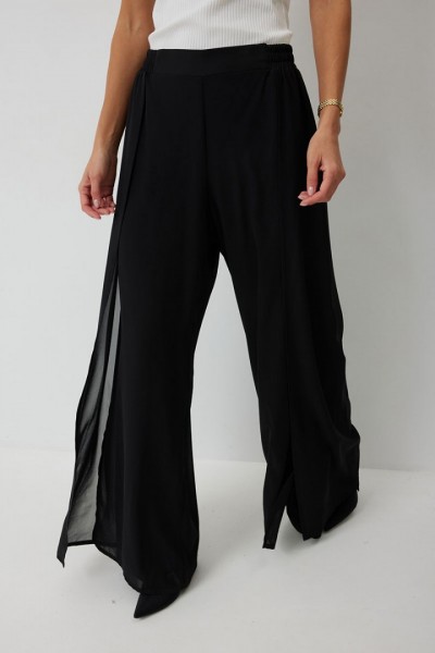 Брюки прямого силуэта, выполнены из шифоновой ткани на подкладке полной длинны. Боковой шов брюк открыт. Синка брюк заходит на перед по верхней части. Подкладка из не просвещающейся креповой ткани. Верх брюк обработан отрезным поясом. Центральная часть пояса без резинки, остальной пояс на резинке. Низ брюк обработан швом « в подгибку».