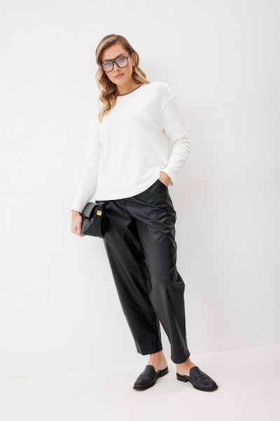 Брюки женские из искусственной кожи зауженные к низу. На передних частях брюк обработаны карманы с отрезным бочком и застрочены складки. По концам кармана установлены хольнитены. По спинке брюк накладные карманы с хольнитенами на концах и отрезной кокеткой. Верхний срез брюк обработан отрезным поясом со шлевками. Брюки застегиваются по переду на «молнию» в гульфике и кнопку по поясу.