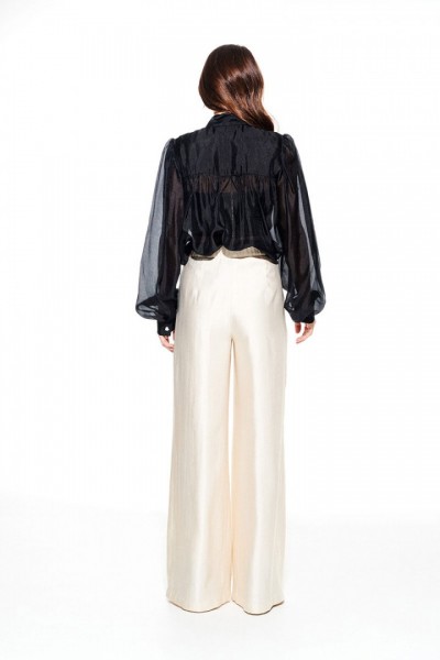 Брюки свободного объема, расширенные к низу. На передних половинках выполнены боковые карманы с отрезным бочком и встречные складки. На задних половинках талиевые вытачки. Застежка – гульфик на молнии. Пояс притачной, с резинкой по спинке, застежкой на крючок и потайную пуговицу.