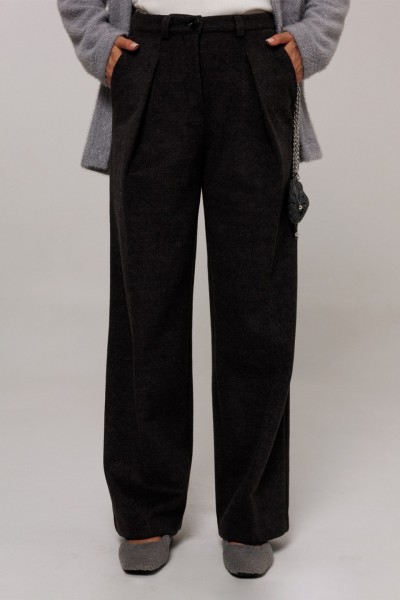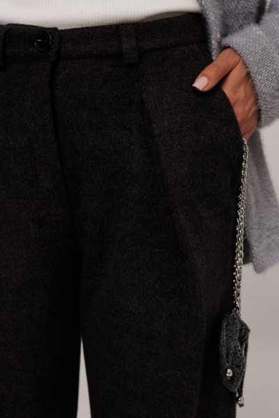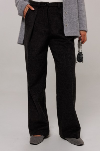 Элегантные брюки прямого силуэта из качественной пальтовой ткани тёмно-серого цвета. Модель выполнена на притачном поясе с шлевками для ремня, обеспечивая классический вид. Стильный элемент - застежка-гульфик с кнопкой и крючком, скрытым под петлей-пуговицей, добавляет утончённости. Оформление передней части с аккуратной складкой и заутюженной стрелкой от складки делает фигуру более стройной. Практичные карманы в боковых швах с наклонным входом удобны для использования. На спинке брюк предусмотрены вытачки, подчеркивающие крой и заутюженные стрелки, продолжающие линию фигуры по всей длине. Эти изысканные брюки будут стильным дополнением к деловому или повседневному гардеробу.