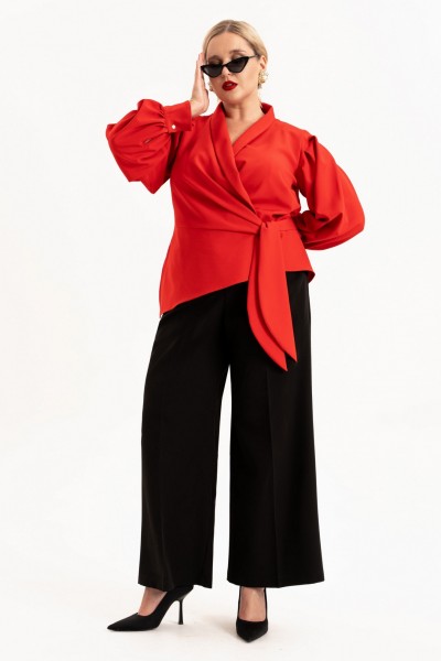 Практичные и функциональные брюки гармонично сочетают комфорт и современный стиль. Незаменимый элемент гардероба для тех, кто ценит удобство в сочетании с актуальным дизайном. Брюки с широкими штанинами палаццо выгодно подчеркивают женственные формы, а свободный крой обеспечивает удобство в любой ситуации. На брюках обработаны карманы в боковых швах, по талии пояс с застежкой на молнию и частично на резинке. Благодаря использованию высококачественных материалов, они обладают отличной плотностью фактуры, обеспечивая удобство и долговечность. Высокая посадка добавляет элегантности и стройности фигуре, а прямая модель идеально подходит для женщин с любым типом фигуры, а также высокого и низкого роста. Благодаря наличию резинки на талии обеспечивают идеальный силуэт и удобство при носке. Классическая модель для полных леди и девушек плюс сайз. Отличное решение для всех кто ищет стильные базовые брюки большого размера. Длина рукава (см): 62 Длина блузы (см): 67