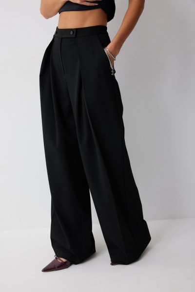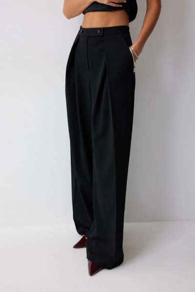 Брюки прямого силуэта расширенные книзу из костюмной ткани. По верху брюк притачной пояс с застежкой на петли и пуговицы. На передних половинках обработана застежка молния в среднем шве. На передних половинках карманы и декоративные складки. По поясу задних половинок брюк резинка и вытачки. Обращаем ваше внимание, что фурнитура может отличаться от фото.