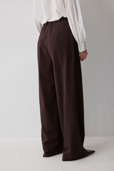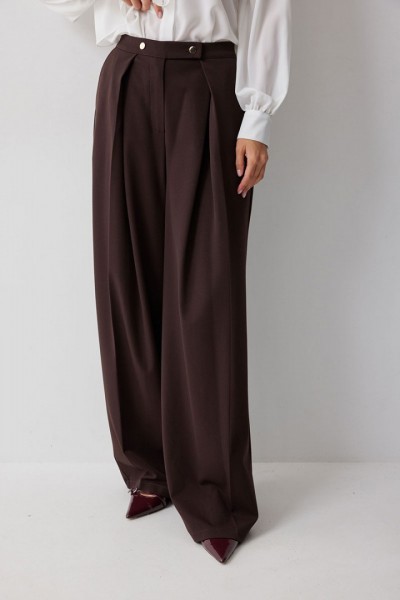 Брюки прямого силуэта расширенные книзу из костюмной ткани. По верху брюк притачной пояс с застежкой на петли и пуговицы. На передних половинках обработана застежка молния в среднем шве. На передних половинках карманы и декоративные складки. По поясу задних половинок брюк резинка и вытачки. Обращаем ваше внимание, что фурнитура может отличаться от фото.