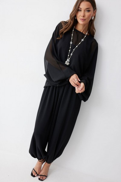 Брюки шаровары свободного, расширенного силуэта, по низу со сборкой. Из струящейся ткани. Пояс с резинкой. По низу манжеты с резинкой.