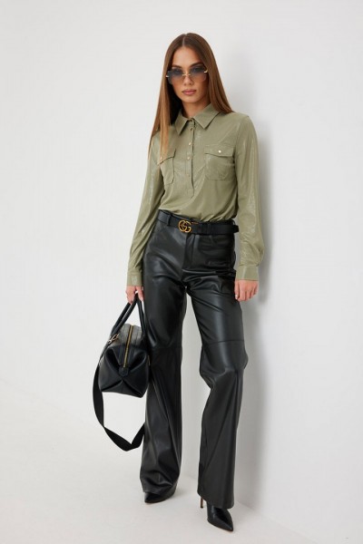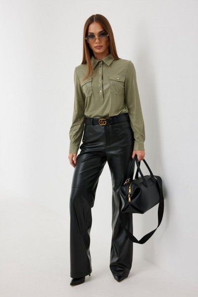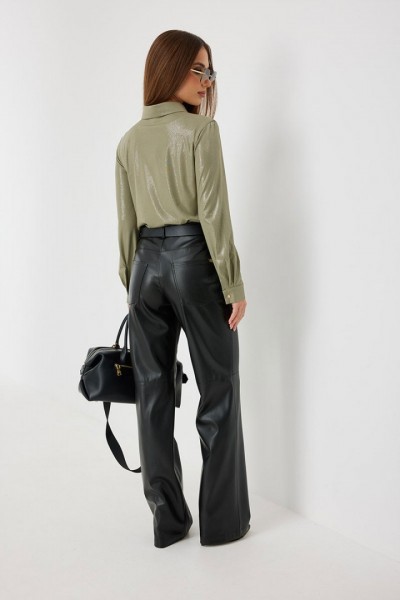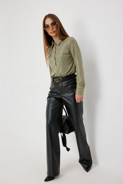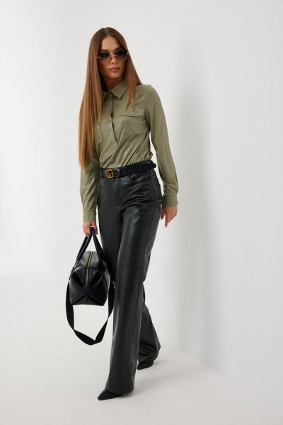 Брюки прямого силуэта из экокожи. Застёжка по переду на молнию и кнопку на поясе. Пояс притачной со шлёвками. По переду боковые карманы. Сзади накладные карманы. На брюках выполнен декоративный подрез.