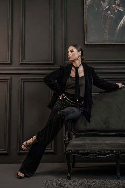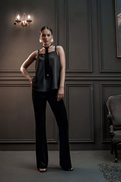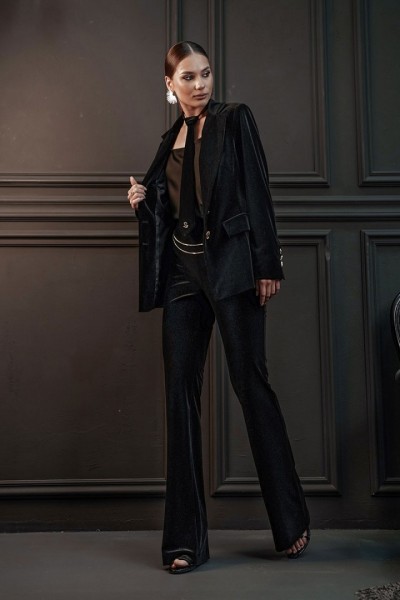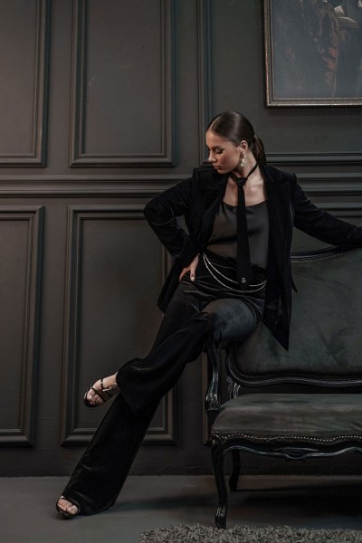 Брюки женские из трикотажного полотна «бархат», прилегающего силуэта, удлинённые, расклешенные книзу, с высокой посадкой, пояс притачной с резинкой сзади, застежка в боковом шве на потайную молнию. Пояс брюк спереди декорирован съемной цепочкой.