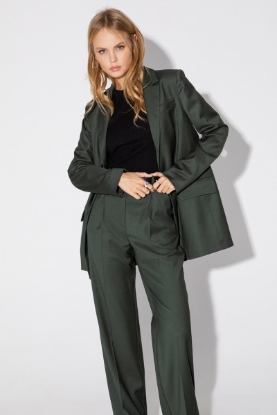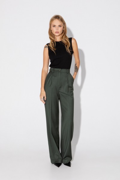 Детали: высокая посадка, широкие и длинные брюки, притачной пояс со шлевками, передние половины с небольшими застроченными мягкими складками и заутюженными стрелками, застежка на молнию и пуговицу, боковые карманы.