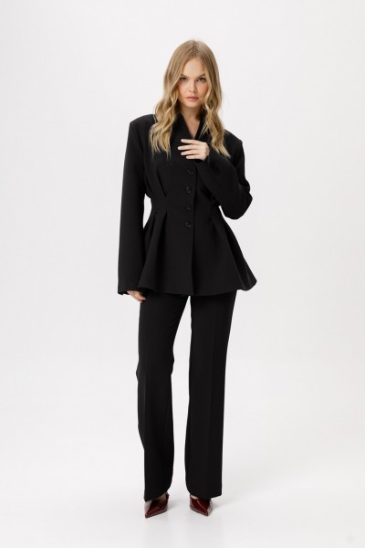 Детали: притачной пояс со шлевками, передние половины с заутюженными стрелками, застежка на молнию и потайные крючки, боковые карманы. Задние части брюк с вытачками и заутюженными стрелками. Пояс брюк без резинки.