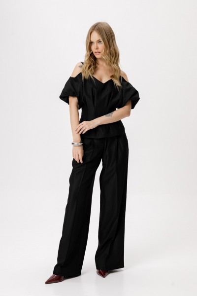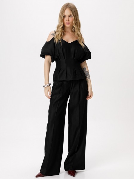 Детали: брюки с притачным поясом со шлевками, складки у пояса, застежка на молнию и пуговицу, боковые карманы, заутюженные стрелки. Задние части брюк с вытачками и имитацией карманов.