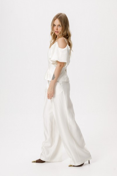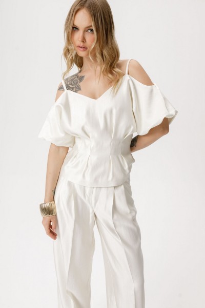 Детали: брюки с притачным поясом со шлевками, складки у пояса, застежка на молнию и пуговицу, боковые карманы, заутюженные стрелки. Задние части брюк с вытачками и имитацией карманов.