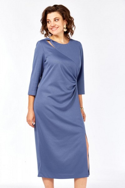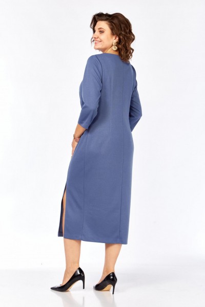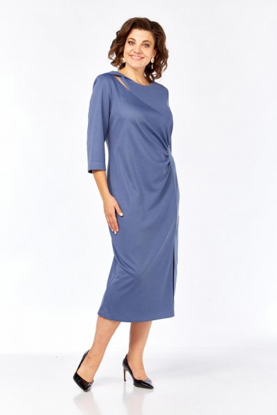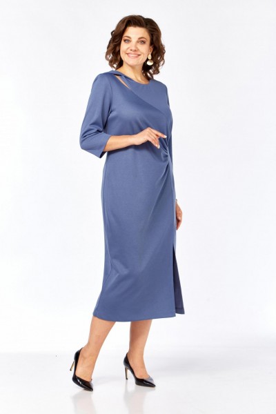Лаконичное женское платье прямого силуэта из трикотажного полотна в длине миди. Вырез горловины округлый. Перед с декоративным подрезом по линии груди и рельефом из бокового шва, в котором выполнена мягкая сборка, скрывающая недостатки фигуры. По низу рельефа обработан разрез. Спинка с центральным швом и талиевыми выточками. Рукав одношовный втачной длиной ¾.