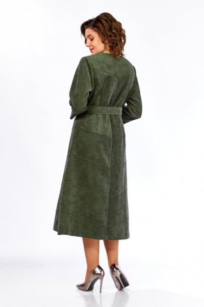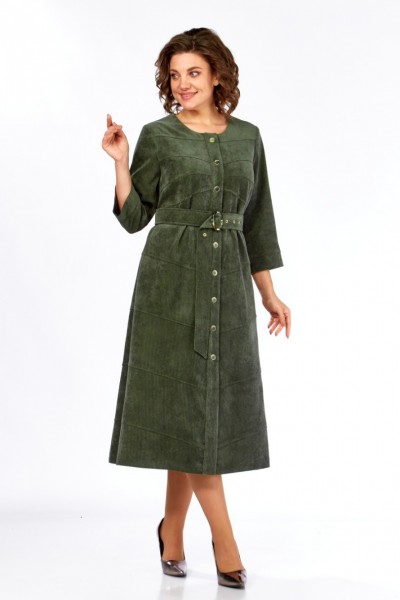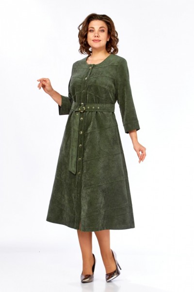 Платье женское А-силуэта из штруксовой ткани в длине миди. Перед с округлым вырезом и центральной застежкой на петли-пуговицы. В боковых швах функциональные карманы. Спинка с кокеткой и средним швом. Перед и спинка платья оформлены косыми подрезами по всей длине изделия. Рукав одношовный втачной, снизу на притачной манжете. Платье дополняет съемный пояс с декоративной пряжкой.