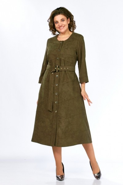 Платье женское А-силуэта из штруксовой ткани в длине миди. Перед с округлым вырезом и центральной застежкой на петли-пуговицы. В боковых швах функциональные карманы. Спинка с кокеткой и средним швом. Перед и спинка платья оформлены косыми подрезами по всей длине изделия. Рукав одношовный втачной, снизу на притачной манжете. Платье дополняет съемный пояс с декоративной пряжкой.