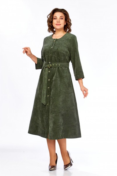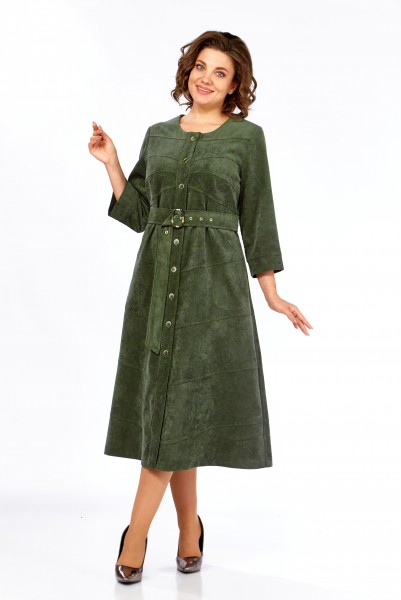 Платье женское А-силуэта из штруксовой ткани в длине миди. Перед с округлым вырезом и центральной застежкой на петли-пуговицы. В боковых швах функциональные карманы. Спинка с кокеткой и средним швом. Перед и спинка платья оформлены косыми подрезами по всей длине изделия. Рукав одношовный втачной, снизу на притачной манжете. Платье дополняет съемный пояс с декоративной пряжкой.