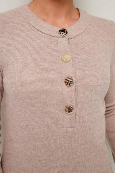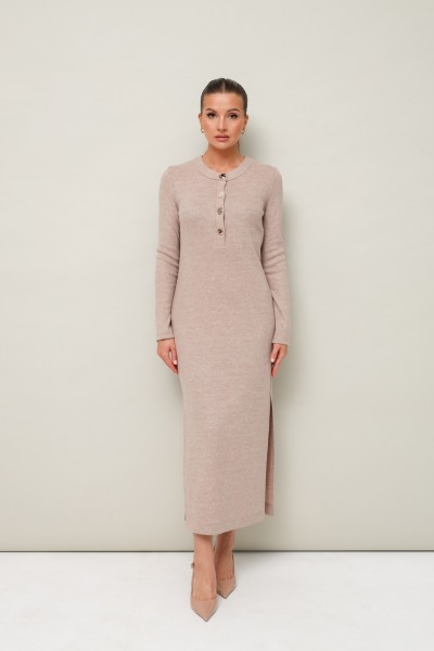 Стильное платье полуприлегающего силуэта, выполнено из трикотажного полотна. Горловина округлой формы, с центральной застежкой на петли и 4 разных пуговицы. Рукава длинные втачные. В боковых швах обработаны высокие