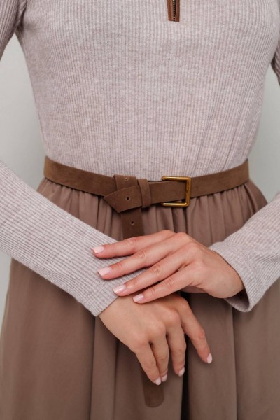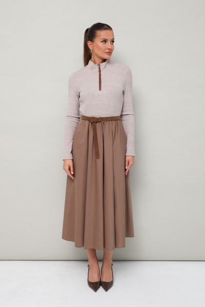 Лиф прилегающего силуэта, выполнен из трикотажного полотна. Горловина с притачным воротником-стойкой. Застежка центральная на тесьму-молнию с притачными планками до линии груди. Рукава втачные длинные. Для комфорта и регуляции размера по талии обработана резинка. Юбка А-силуэта с боковыми наклонными карманами, выполнена из матовой тафты. В комплекте прилагается съемный ремень.