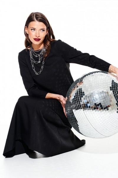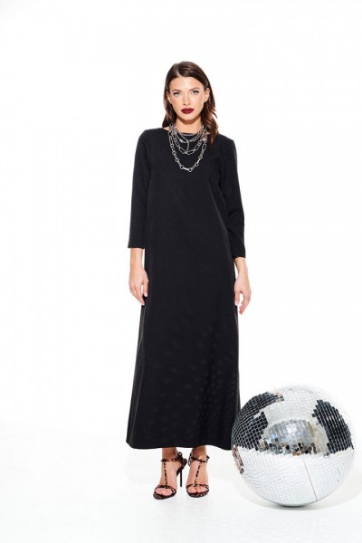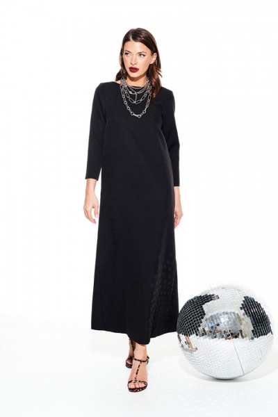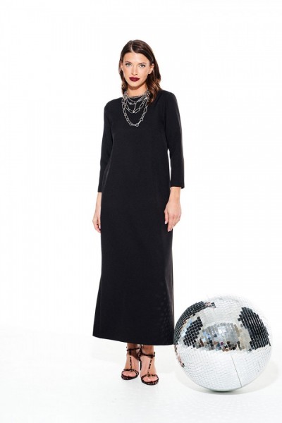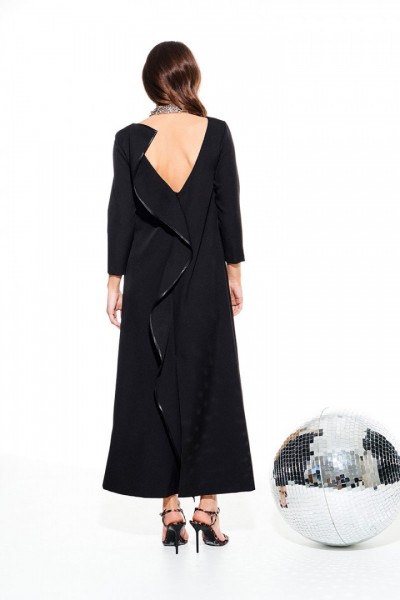 Платье из костюмно-плательной ткани, умеренного объема, прямого силуэта, с застежкой на потайную молнию в среднем шве спинки. Перед с круглым вырезом горловины и нагрудными вытачками. Спинка с V-образным вырезом горловины, средним швом и разрезом. Вырез горловины и средний шов спинки оформлены воланом. Рукав 3/4, втачной, одношовный. Длина платья до щиколотки.