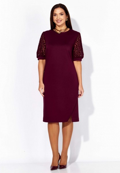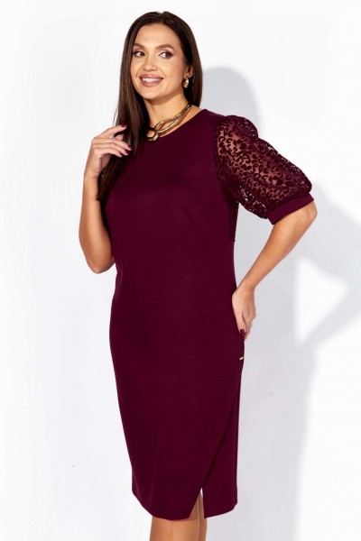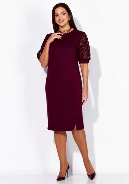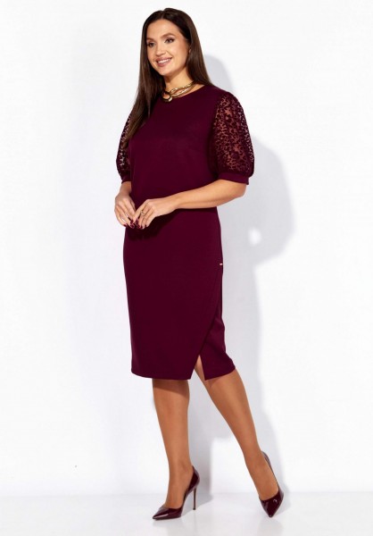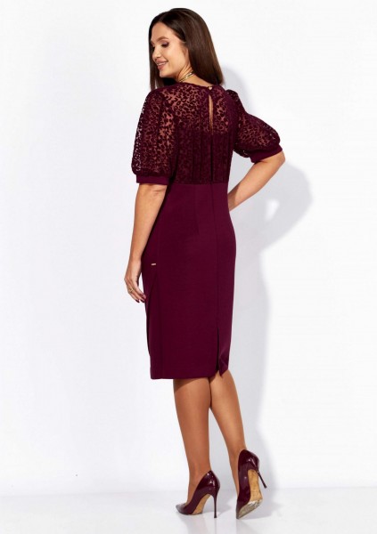 Платье женское, полуприлегающего силуэта с коротким рукавом. Рукав типа "фонарик" со сборкой сверху и снизу. По низу притачная манжета. По переду нагрудные вытачки. Горловина круглой формы. По низу асимметричная, отлетная планка с разрезом и декоративная нашивка. По спинке средний шов с разрезом снизу и талевые вытачки. Горизонтальный подрез выше линии талии. Верхняя часть спинки и рукав выполнены из ткани сетка с флоковым нанесением. Застежка на потайную "молнию".