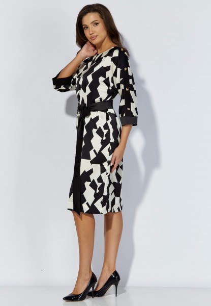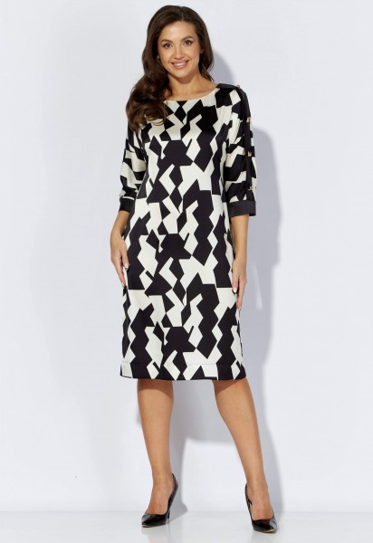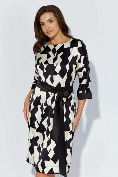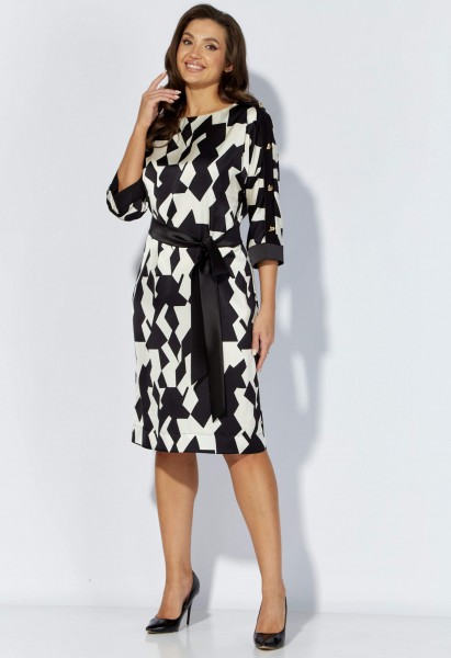 Платье женское, прямого силуэта с цельнокройным рукавом длинной 3/4. По низу рукава притачная манжета. Слева, в шве рукава, отлетная планка, закрепленная на петли и отделочные пуговицы. Вырез горловины круглой формы. Сзади средний шов и застежка на потайную "молнию". Талию подчеркивает съемный пояс.