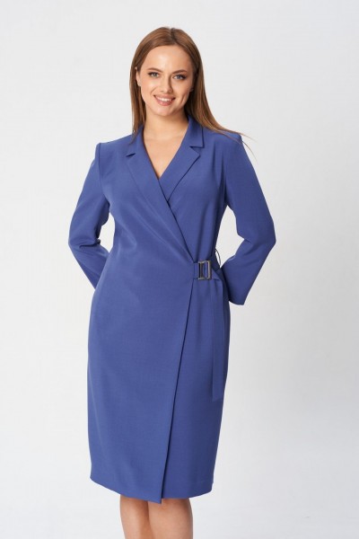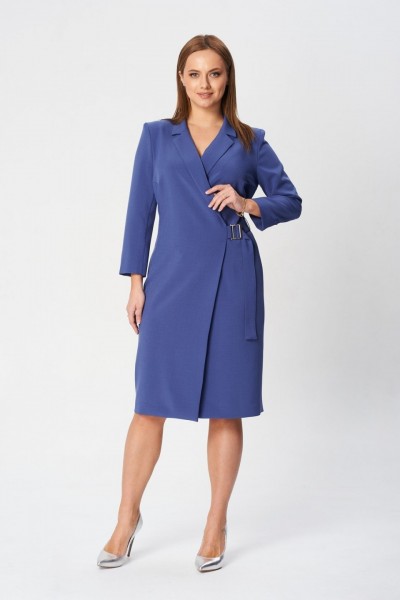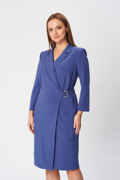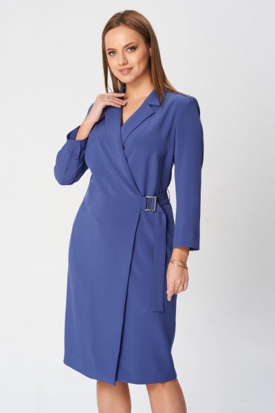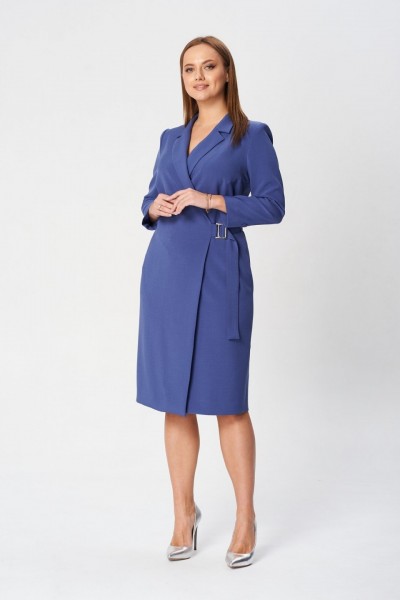 Платье полуприлегающего силуэта с запахом. Застегивается на пояс с пряжкой и на потайную пуговицу. На полочке нагрудная и талевая выточки. На спинке талевые выточки и вставка с резинкой по линии талии. Воротник пиджачного типа с удлиненными лацканами. Рукава двухшовные с выточной щлицей по локтевому шву. На рукавной шлице — пуговица.