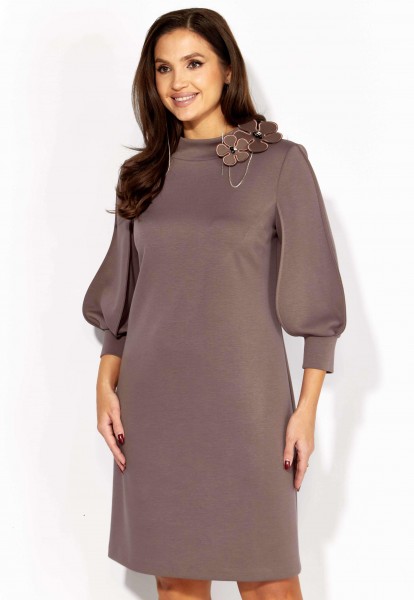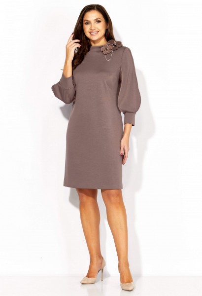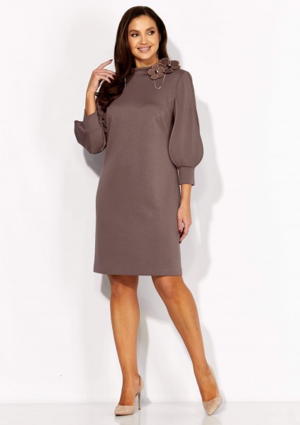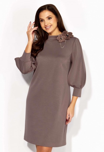 Платье женское, А-силуэта с втачным рукавом, длинной 3/4. Рукав фантазийной формы, типа "фонарик" состоящий из четырех деталей. Швы рукава отстрочены стройкой "на ребро" По переду нагрудные вытачки из пройм. Горловина оформлена расширенной, мягкой строчкой. Декором служит съемное украшение.