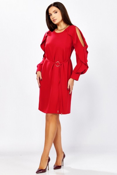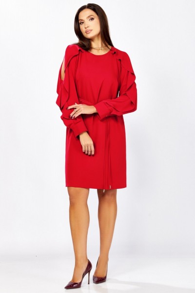 Романтичное платье прямого силуэта, без подкладки. Округлый вырез горловины обработан бейкой. Перед с нагрудной вытачкой. Рукав реглан с вырезом и двумя рюшами. Рукав с манжетой по низу. застегивается на 2 пуговицы и петли. Спинка со средним швом и вырезом «капелька» с завязками на концах с наконечниками. Имеется съемный пояс-завязки с кольцом и наконечниками на концах. Длина рукава от горловины- 69см, длина по синке-97см.