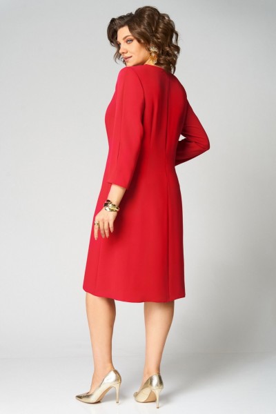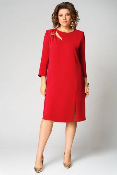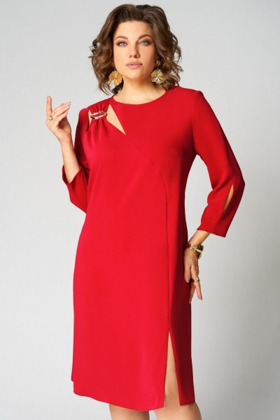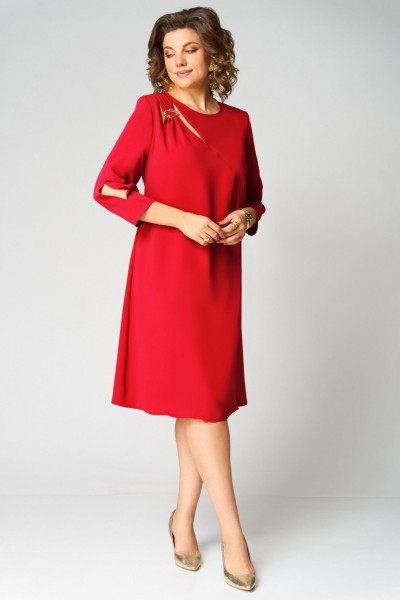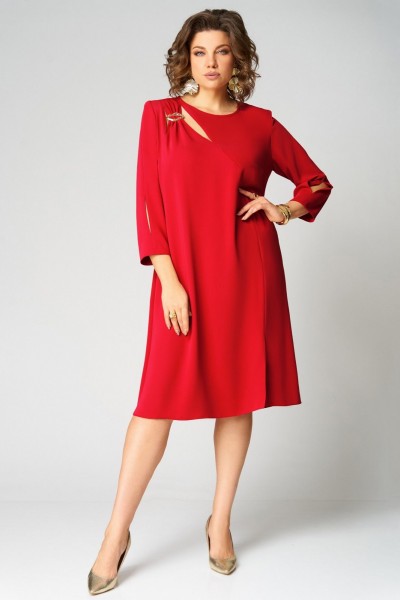 Нарядное платье А- силуэта, без подкладки. Округлый вырез горловины обработан бейкой. Перед с фигурным подрезом и разрезом по низу. По правой стороне переда легкая драпировка с декоративной пряжкой и двумя вырезами. Рукав втачной, двухшовный с вертикальным разрезом в локтевом шве. Спинка со средним швом и застежкой сзади на потайную тесьму-молнию. Длина рукава от горловины- 50 см, длина по синке-104 см.