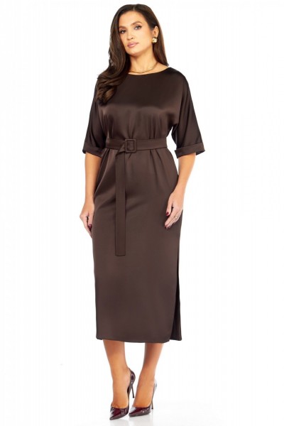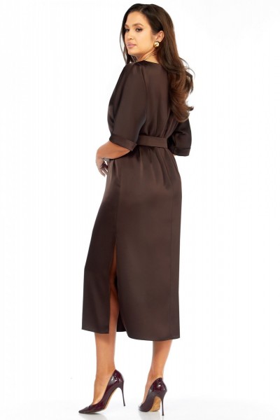Платье прямого силуэта выполнено из атласа. Округлый вырез горловины. С левой стороны имеется разрез. Рукав цельнокроеный с отложной манжетой. Спинка со средним швом. Имеется съемный пояс. Длина по спинке-120 см, длина рукава –22 см.