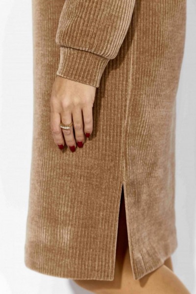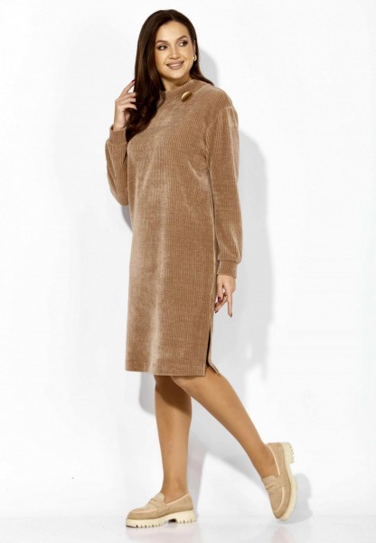 Платье женское, прямого силуэта с длинным рукавом. Рукав со спущенной линией плеча, по низу на манжете. Горловина оформлена высокой, мягкой стойкой. По боку разрез, акцентирован декоративной сточкой. Спинка без особенностей.