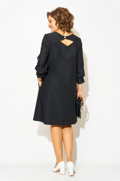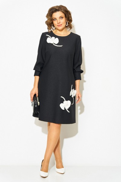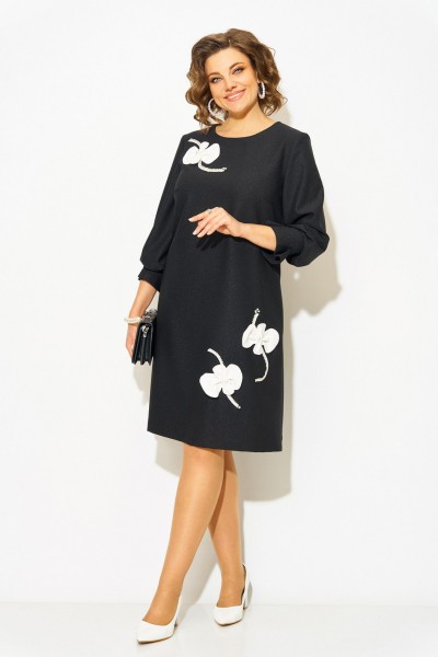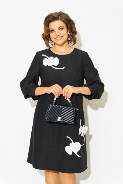 Нарядное черное платье А-силуэта – визуально вытягивает фигуру, не подчеркивая талию и придает изящность. Материал средней плотности из костюмно-плательной ткани с мерцающим эффектом. Вырез горловины округлый, в боковых швах предусмотрены карманы. Рукав вточной, с заложенными складками-за щипами по низу. Спинка с декоративным вырезом и застежкой на петлю и пуговицу. Изюминкой данной модели является шикарная аппликация в виде декоративного цветка – орхидеи украшенного бусинами и жемчугом. Длина по спинке – 95 см, длина рукава – 58 см.