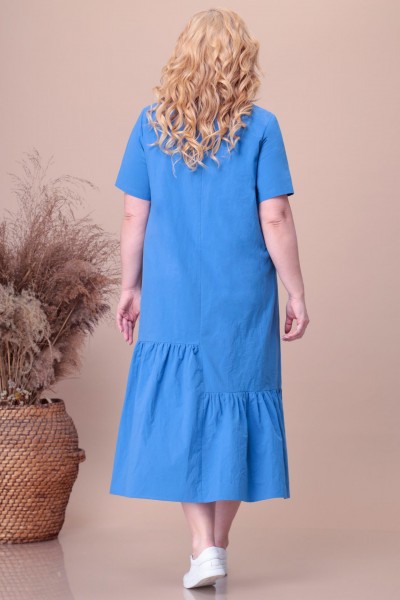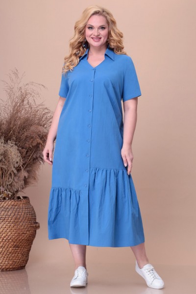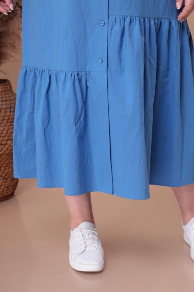 Летнее платье из 100% хлопка с эффектом мятости на рост 164см. Длина миди, прямой силуэт, в нижней части платья за счет волана легкое расширение. Рукав втачной короткий. Вырез горловины V-образный с воротником и отрезной стойкой. По переду нагрудные вытачки из проймы. Застежка центральная на петли и пуговицы. По спинке средний шов. Длина спинки -- 123см. ПОГ:54р-58см, 56р-60см, 58р-62см. ПОБ:54р-62,5см, 56р-64,5см, 58р-66,5см.