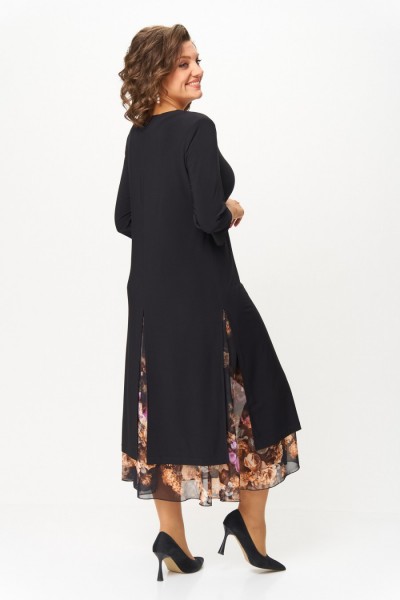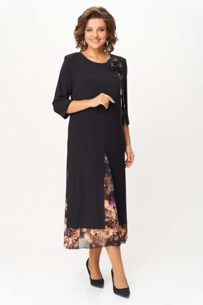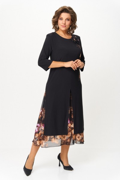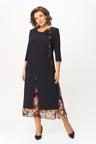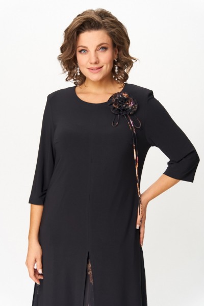 Платье женское полуприлегающего силуэта расширенное к низу, выполнено в комплектации из двух предметов. Верхнее платье – из мягкого эластичного материала, с высокими разрезами по переду, спинке и бокам, с втачным рукавом ¾. По линии груди вытачки. По левой части переда съемный цветок.