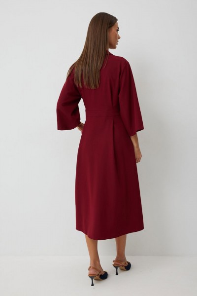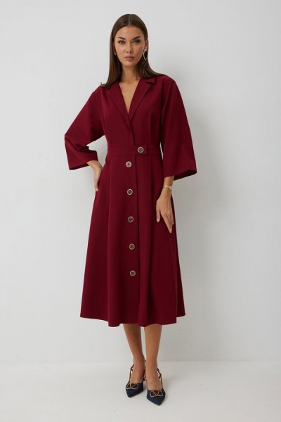 Платье женское полуприлегающего силуэта, отрезное по линии талии с застежкой по центральной части переда на декоративные пуговицы. Платье длиной до середины икры. По отрезному лифу с юбке полочки и спинки заложены складки. Лиф с юбкой соединены втачным поясом, по которому прострочена отделочная строчка. Рукав втачной прямой до середины локтя. По пройме прострочена отделочная строчка. Горловина платья обработана втачным воротником с отложными лацканами.